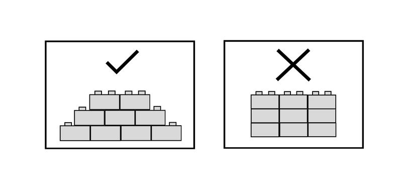 Lay interlocking bricks row by row